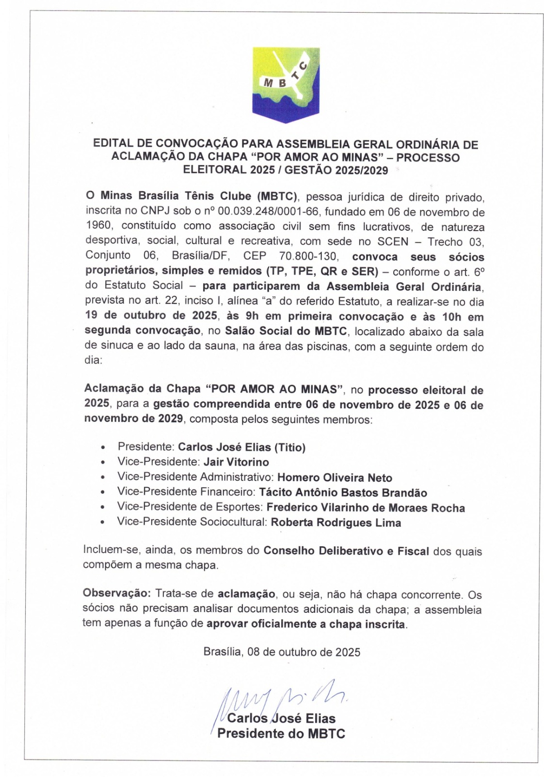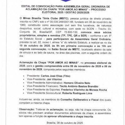 A Diretoria do Minas Brasília Tênis Clube tem a satisfação de convocar todos os sócios para participarem da Assembleia Geral de Aclamação da chapa “Por Amor ao Minas”, que será realizada no dia 19 de outubro de 2025 (domingo), no Salão Social do Minas Brasília Tênis Clube.