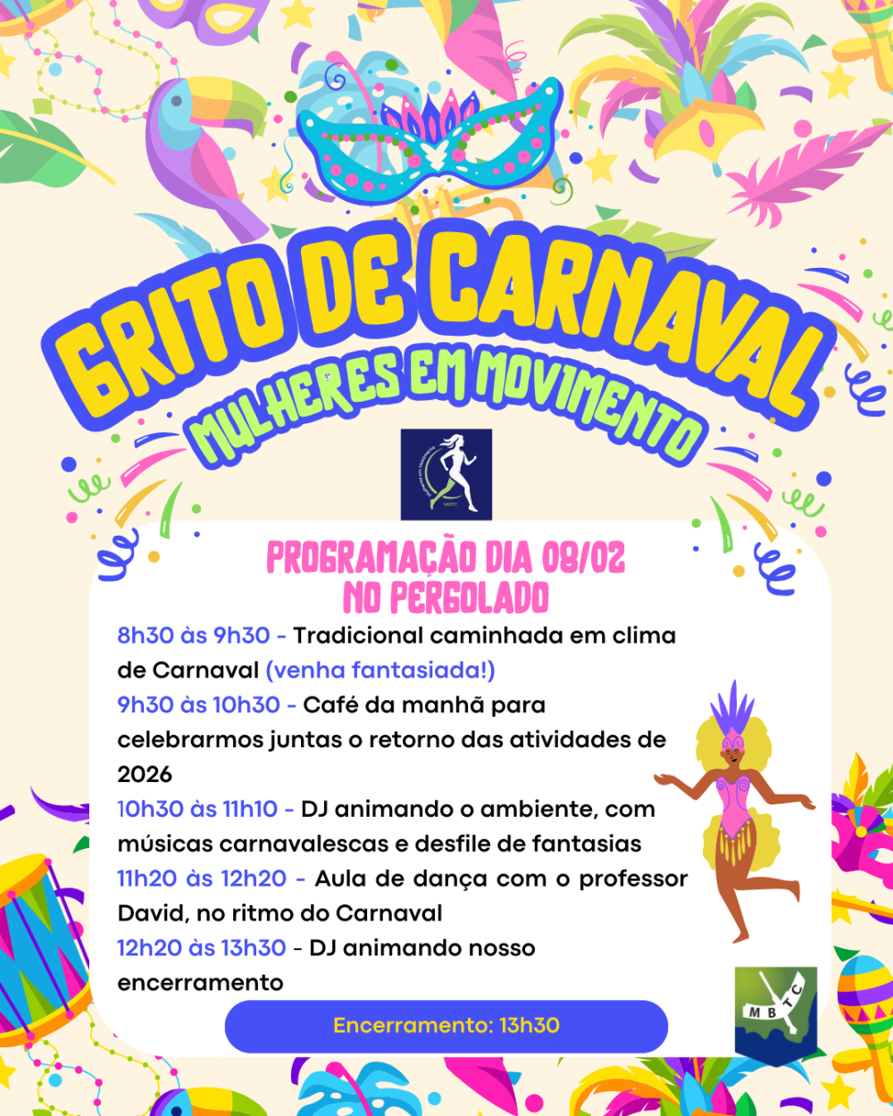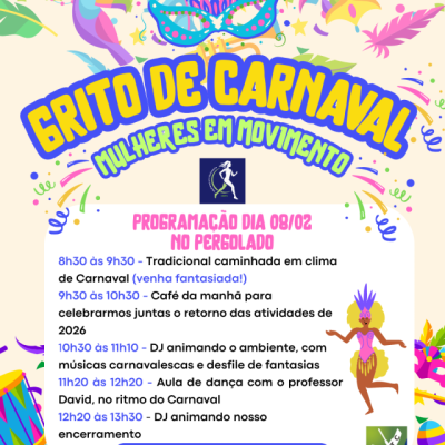 É com muita alegria que convidamos todas para o retorno das atividades do programa Mulheres em Movimento, que acontecerá em clima de Carnaval, com um animado Grito de Carnaval, no dia 08 de fevereiro de 2026, a partir das 8h30, no Pergolado.